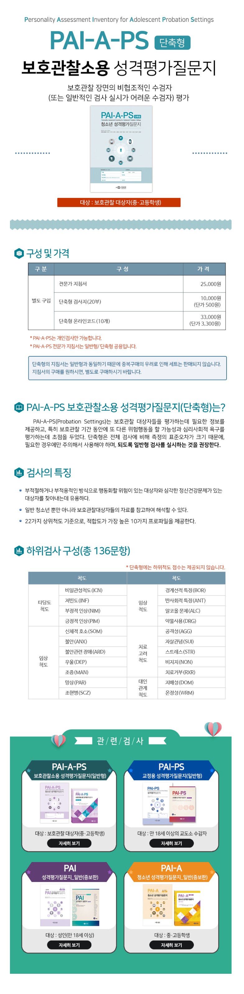 home > 교육용품 > 심리검사도구2 > PAI-A-PS 보호관찰소용 성격평가 질문지_단축형 /[구성]검사지20, 온라인코드10, 전문가지침서